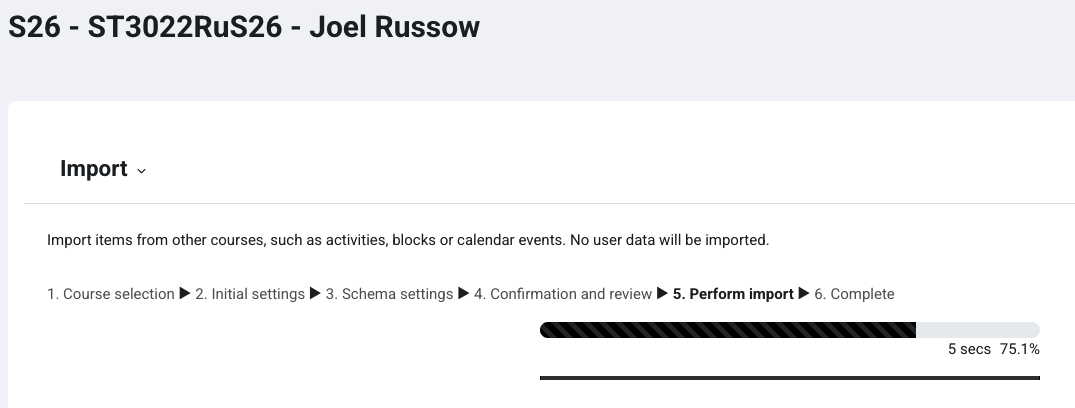 The system will start the import. The import may take some time depending on how much data is in the old course.