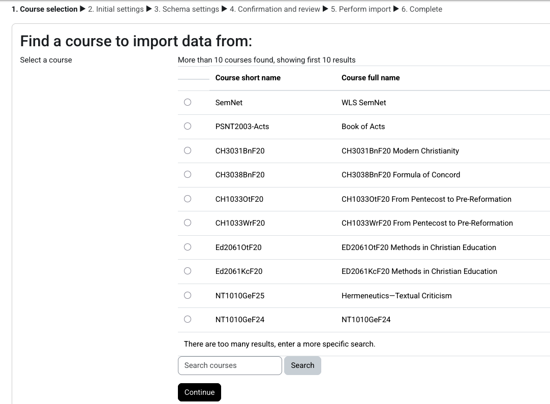 A new page will display with a list of courses that match your parameters. Select the radio button next to the course you want to import into the new course. Click Continue.